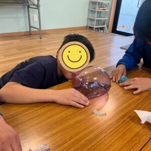 ストローを使って息を吹きかけて、スライムが膨らむ様子にとても興味津々でした