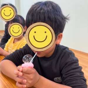 ストローを使って息を吹きかけて、スライムが膨らむ様子にとても興味津々でした